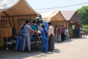 當日,記者在內比都國際機場看到,來自俄羅斯、泰國等國家和地區的救援隊在此集結,準備前往災區協助救援。泰國救援人員卡莊薩(Khajornsak)對記者表示,他們在內比都部署了兩個小組,一組負責城市搜索與救援,另一組是醫療緊急救援隊。