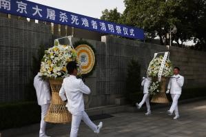 【中新社南京4月4日電】(記者 朱曉穎)南京大屠殺死難者清明祭儀式4日在侵華日軍南京大屠殺遇難同胞紀念館南京大屠殺遇難者名單牆(俗稱“哭牆”)前舉行。南京大屠殺倖存者、南京大屠殺死難者遺屬、青少年學生、國際留學生等手持菊花肅立,祭奠南京大屠殺死難者。灰色厚重的“哭牆”上,黃白色菊花圍成“奠”字。工作人員敬獻花籃,全體人員向南京大屠殺死難者行三鞠躬禮。