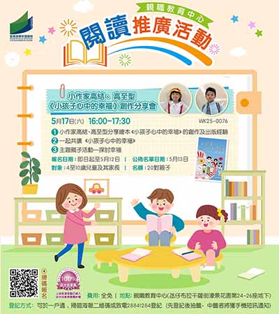 高結、高至型續稱,除參與慈善活動外,也積極推廣閱讀寫作,下月十七日將在澳門教育及青年發展局親職教育中心舉辦「小作家高結、高至型《小孩子心中的幸福》創作分享會」,向四至十歲兒童及家長分享創作及出版經驗、一起共讀圖書及開展主題親子活動,共同探討幸福,歡迎大家報名參與。同時,他們透露,第三本新書《二十四節氣飲乜好》將於六月出版,敬請大家繼續支持。此外,他們也會在本澳書展及到國內分享創作與出版經驗、向大學捐贈圖書、捐建港澳台圖書專館、捐贈購書經費等,促閱讀寫作與國家教育發展。