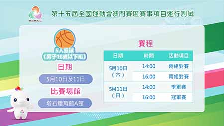 為了對賽事運行的各個環節進行檢視和優化,十五運會及殘特奧會澳門賽區籌備辦公室將在5月及6月舉行十五運會5個比賽的項目運行測試,當中,5人籃球(男子18歲以下組)將率先於本週末(5月10及11日)下午兩時在塔石體育館A館舉行,來自澳門、珠海、中山、江門的球隊將抽籤分成兩組對賽,賽事將開放予市民及旅客入場觀賞,提前感受全運會盛事的氣氛。