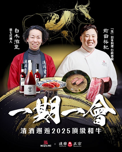 而在 5 月 23 日及 24 日晚上,前田總廚將帶來另一場精彩絕輪的清酒盛宴,於「泓」日本料理攜手享譽國際的「達磨正宗」釀造廠(Daruma Masamune),呈獻珍稀「冠軍和牛」與陳釀清酒的搭配饗宴。早前,前田總廚親赴日本參與頂級和牛拍賣會,並成功競得來自宮崎縣的「冠軍和牛」,將與「達磨正宗」一系列獲獎清酒完美搭配出舌尖火花。「達磨正宗」釀造廠1835 年於日本岐阜縣創立,至今已擁有 190 年歷史;1971 年第六代釀酒師白木義二(Yoshiji Shiraki)決定專注於釀製陳年清酒,最終發現留下更多的米粒可釀造出更濃郁甜美的清酒,並首創具有非凡深度和鮮味的黃金陳年清酒。此次佳餚美酒活動中,白木義二的女兒——第七代釀酒師白木滋里(Shigeri Shiraki)將親臨澳門,帶領賓客開啟這一趟珍貴的清酒之旅。