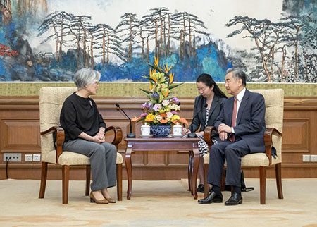 【中新社北京5月21日電】5月20日,中共中央政治局委員、外交部長王毅在北京會見美國亞洲協會會長康京和。