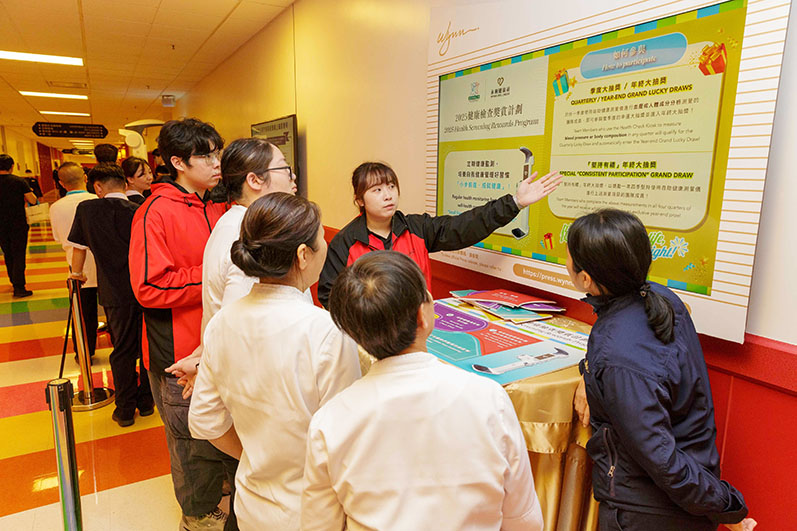 永利於年初為設於後勤區的自助健康檢測儀增加了人體成分分析檢查功能,方便團隊成員了解體水分率、體脂率、內臟脂肪值等身體數據,從而更深入掌握個人身體狀況。永利亦於後勤區舉辦相關推廣活動,並推出年度「健康檢查獎賞計劃」,鼓勵團隊成員定期進行健康檢查和管理,及早預防疾病的發生。同時,永利亦於員工診所推出了「醫生與您」及慢性病篩查兩項全新健康服務,為團隊成員解答健康疑慮並提供專業健康支援,讓他們於工作期間亦能有效監察及管理慢性病情況。