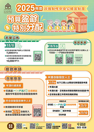 【特訊】社會保障基金(18日)公佈非強制性中央公積金制度2025年度預算盈餘特別分配款項名單,居民早上9時起可透過“一戶通”、社保基金網站www.fss.gov.mo、自助服務機或24小時語音熱線28230230等進行查詢。聲明異議及提款申請可透過“一戶通”提出,同時“一戶通”及社保基金網站亦可查詢自動提款登記狀況及是否符合自動發放條件。
