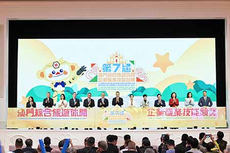 【特訊】由勞工事務局與工聯總會合辦的「2025第七屆澳門綜合旅遊休閒企業職業技能競賽」,今日假永利皇宮舉行啟動儀式。啟動儀式由中聯辦副主任張應杰,經濟財政司司長戴建業,廣東省總工會副主席袁子雅,勞工事務局局長陳元童,工聯總會會長何雪卿,新濠博亞娛樂有限公司主席兼行政總裁何猷龍,金沙中國有限公司行政副主席王英偉博士,澳娛綜合度假股份有限公司常務董事何超鳳,永利澳門有限公司總裁、董事會副主席兼執行董事陳志玲,美高梅中國控股有限公司總裁及首席營運官王志琪,銀河娛樂集團人力資源及行政集團董事呂慧玲,勞工事務局代副局長林秀香,2025第七屆澳門綜合旅遊休閒企業職業技能競賽籌委會主任蔡錦富共同主禮。粵港澳大灣區多個工會組織及深合區代表等嘉賓出席觀禮。勞工事務局局長陳元童和工聯總會副會長兼秘書長梁偉峰先後致辭。