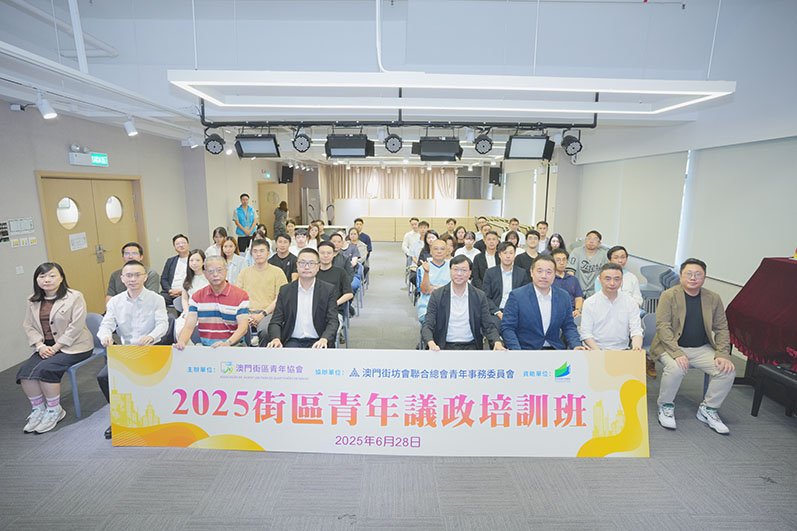 【特訊】 由澳門街區青年協會主辦,街坊總會青年事務委員會協辦,教育及青年發展局資助的2025「街區青年議政培訓班」於6月28日上午在街坊總會藝駿中心舉行。中聯辦社工部副處長鄭奕成,街坊總會理事長陳家良、監事長梁慶球、副理事長梁鴻細,澳門街區青年協會會長顏奕恆,群力智庫副理事長兼秘書長雷民強,街坊總會副理事長兼青委主任鄧文基、副理事長梁俊傑、林焯佳,澳門街區青年協會副會長張婉思、周遠恩及四十多名青年學員參與。