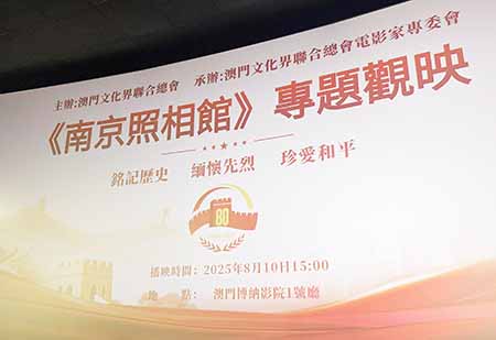 【特訊】今年是中國人民抗日戰爭暨世界反法西斯戰爭勝利八十周年,內地有多部圍繞抗戰的電影上映,本澳亦有團體舉辦專題觀映活動,澳門文化界聯合總會組織《南京照相館》電影觀映活動,近一百人出席,傳承抗戰與珍愛和平的精神。