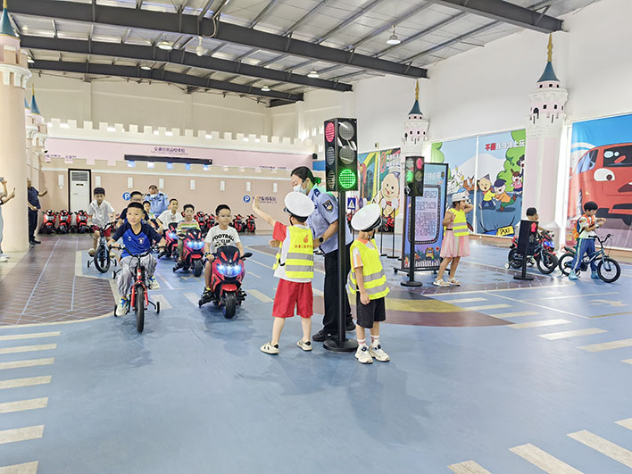在珠海市青少年兒童安全教育基地,兒童學習道路安全標識及交通指揮手勢,模擬路面執勤與校車安全逃生。通過互動遊戲和情景演練讓他們牢記交通規則的重要性。
