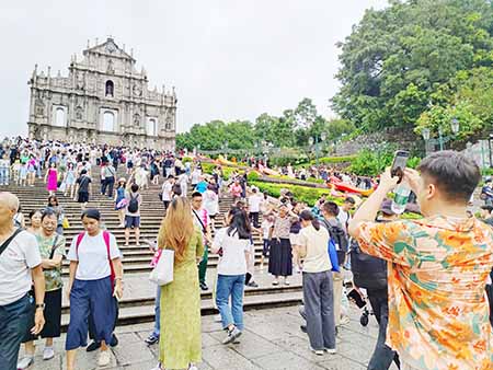 八號風球過後,昨日下午大三巴一帶人流暢旺,雖然天色稍暗並一度有驟雨,旅客冒雨撐傘遊覽及打卡拍照。有安徽旅客稱,昨日早上經關閘口岸抵澳,但由於打風期間澳門公交暫停,所以步行至大三巴,認為現場人流較預期好,不算擁擠;有山西旅客稱,昨日中午來澳,認為颱風影響不大,決定按計劃來澳體驗美食。有飲品店負責人稱,內地國慶中秋長假期首四天,區內人流旺盛,帶動生意增長約五成,期望餘下幾天假期天氣良好,繼續有好生意;有手信店負責人稱,八號風球過後現場人流理想,會繼續透過宣傳及優惠促銷,把握餘下的黃金周假期做出好成績。