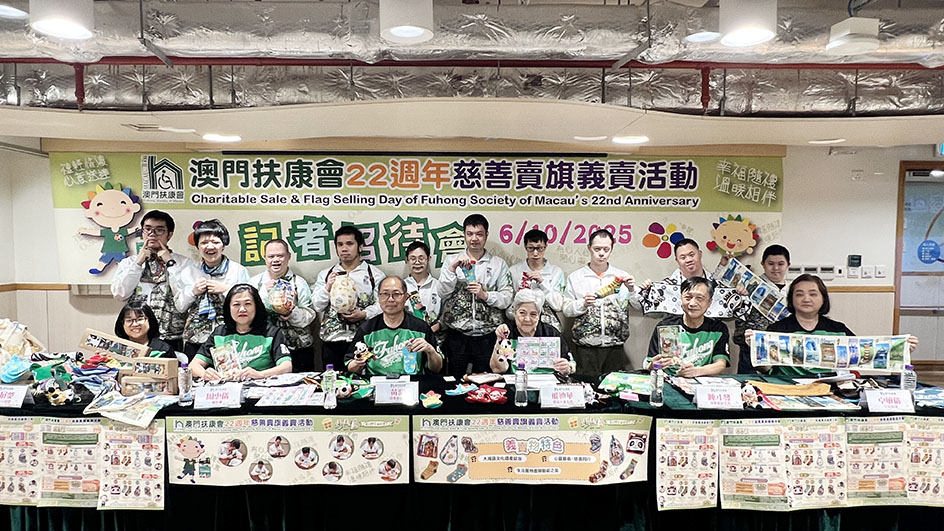 為向社會大眾介紹本年度賣旗籌款項目,澳門扶康會於2025年10月6日下午三時在轄下寶利中心舉行《澳門扶康會二十二週年慈善賣旗義賣活動》,會員大會主席飛迪華、理事會主席黃濠、理事會副主席陳才發及總幹事周惠儀、行政經理卓敏儀及寶利中心經理余展熒為到場媒體一一介紹活動細項。