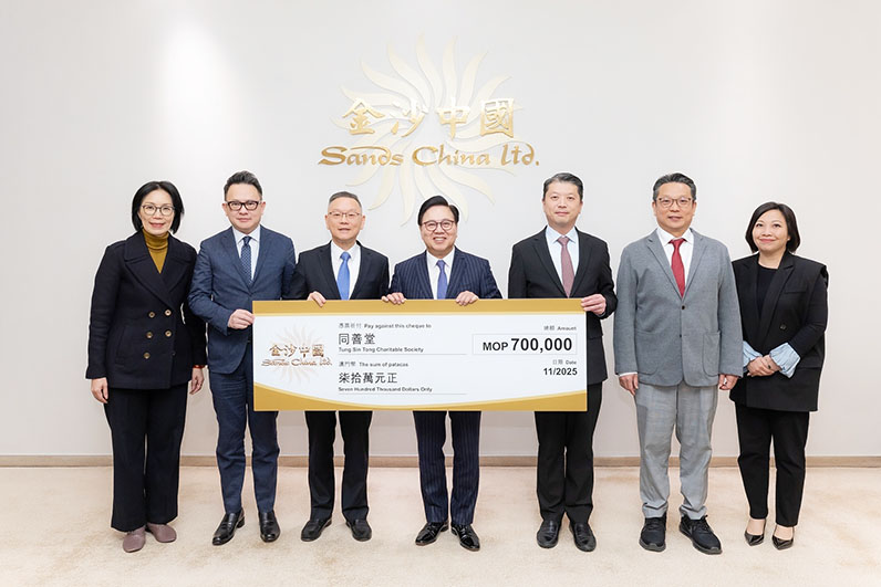 【特訊】金沙中國有限公司於11月20日在澳門威尼斯人®舉行支票捐贈儀式,向澳門同善堂捐贈澳門幣70萬元,連續22年響應該社服機構的年度「沿門勸捐」籌款活動,全力支持同善堂各項慈善服務推展。