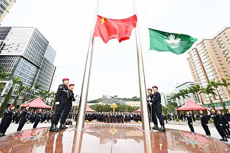 特區政府於昨日早上八時在金蓮花廣場舉行升旗儀式,慶祝澳門特別行政區成立二十六周年。現場奏起國歌、全場肅立,國旗和區旗徐徐升起。行政長官岑浩輝、中聯辦主任鄭新聰、外交部駐澳特派員公署特派員劉顯法、解放軍駐澳部隊司令員于長江、立法會主席張永春、第六屆特區政府主要官員及社會各界人士等約五百五十人出席,不少市民及旅客特地到場觀看升旗儀式。