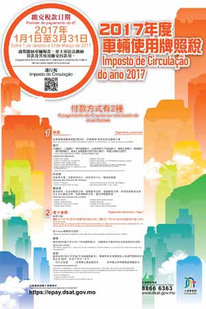 根據《車輛使用牌照稅規章》相關規定,交通事務局於二○一七年一月一日至三月卅一日徵收新一年度汽車、電單車及工業機器車的使用牌照稅。市民可前往交通事務局馬交石炮台馬路卅三號地下、南灣大馬路中華廣場三樓及黑沙環新街五十二號政府綜合服務大樓一樓I區的服務專區;財政局(包括財政局大樓、北區接待中心、氹仔接待中心及龍成收納處);指定銀行包括:中國銀行(卅五間分行)、大豐銀行(廿五間分行)、澳門商業銀行(十四間分行)、大西洋銀行(十八間分行,不包括總行)、華僑永亨銀行(十二間分行)、匯業銀行(七間分行)、澳門國際銀行(六間分行)、香港上海匯豐銀行澳門分行(總行)、中國工商銀行(澳門)(十七間分行);郵政局(包括郵政總局、紅街市郵政分局、濠景郵政分局、望廈郵政分局、海洋花園郵政分局、文化中心郵政分局、石排灣郵政分局及通訊博物館商店)繳交。