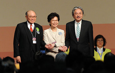 選舉結果揭曉後,點票現場隨即響起掌聲和歡呼聲,林鄭月娥向在場的行政長官選舉委員會委員及香港市民代表等數度深深鞠躬以示感謝。其他兩位候選人曾俊華、胡國興與林鄭月娥握手、擁抱表示祝賀。