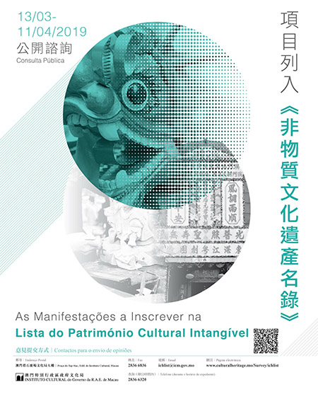 【特訊】為進一步加強對澳門非物質文化遺產之保護,文化局將於3月13日至4月11日期間,對建議列入《非物質文化遺產名錄》的項目進行為期30日的公開諮詢,以廣泛聽取意見。