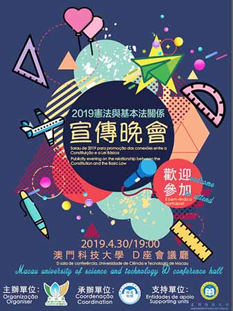 二○一九「憲法與基本法關係宣傳晚會」以多元的形式推廣《憲法》與《基本法》,讓年青人正確理解《憲法》是《基本法》的根和源,並加深認識兩者與日常生活的密切關係。晚會將由澳門科技大學各個學生會屬會社團帶來多個精彩節目,包括法學院同學透過朗誦表達《基本法》的成就,話劇社則以生動方式演繹《憲法》和《基本法》與我們的生活如何緊密連繫;另外,亦有演唱及配音演出環節,加深年青人對《憲法》和《基本法》的認知以及兩者如何保障社會安定繁榮。