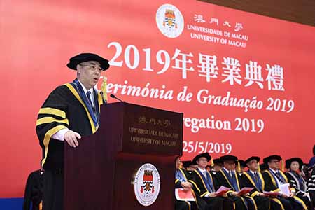 崔世安致辭表示,回顧過去一年,澳門發展日新月異,澳大亦不斷奮勇向前,正式成立智慧城市物聯網國家重點實驗室,協助構建中葡雙語人才培養基地,積極參與粵港澳大灣區的創新科技教育合作,鼓勵學生將個人發展與國家發展緊密融合、愛國愛澳、為建設國家和澳門貢獻力量。澳大積極貫徹特區政府「教育興澳、人才建澳」的施政方針,以優質高效、言傳身教的教師隊伍培育創新型、國際化的高端人才,持續加強人才儲備和創新動力,為澳門「創造更多科技成果,助力澳門經濟適度多元可持續發展。」