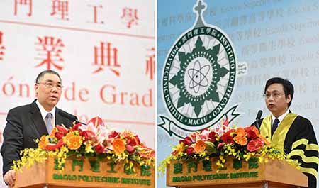 行政長官崔世安致辭中指出,特區政府實施“教育興澳”、“人才建澳”的發展戰略,全力推進教育均衡發展,實現以教育公平推進社會公平。藉著《高等教育制度》生效的機會,推動高等教育走向新的發展階段;鼓勵高校鞏固和創新本地教育的特色和魅力,推進產學研的結合,提升科技創新能力,為經濟適度多元提供人才儲備;持續優化教學環境和教學設施,加強院校師資培訓,保障教育素質持續提升。崔世安表示,特區政府繼續支持理工學院發揮培養實用型人才的優勢,依法務實地設立新課目,開辦更高學歷的新課程,開展跨學科研究,為澳門建設中葡雙語人才培訓基地出力,為加快建設“一中心、一平台”、為積極參與“一帶一路”和“粵港澳大灣區”建設,拓寬人才儲備。崔世安勉勵畢業生及青年人與祖國進入新時代,澳門邁向新階段共同前行,時代擴闊了發展空間,也承載著時代使命。並希望畢業生惜時光、勤學習、健體魄、立志向、敢擔當,在人生的道路上,腳踏實地,放飛青春夢想。