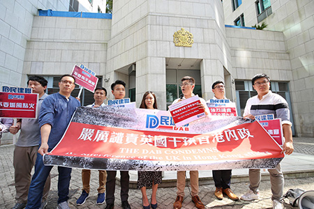 民建聯副秘書長顏汶羽表示,近期因反對修訂《逃犯條例》而引發的連串暴力衝突,以及警方的處理方法等事件,完全屬於香港特區的內部事務,與英國政府或拉布管轄的外交部毫無關聯。民建聯嚴正要求英國立即停止任何干預香港內部事務的言論及行為。