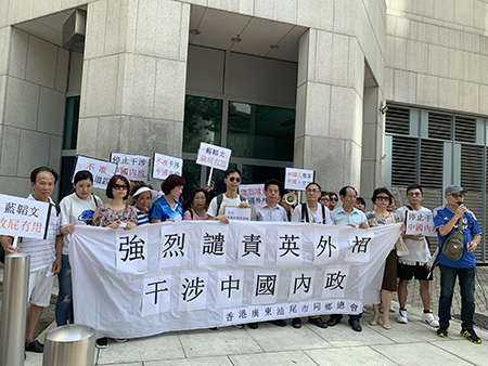 當日,香港廣東汕尾市同鄉總會代表亦赴英國駐香港總領事館示威抗議,市民高呼“譴責英國外相,干涉中國內政”“中國家事,中國自理”的口號,並向英國駐香港總領事館遞交請願信。