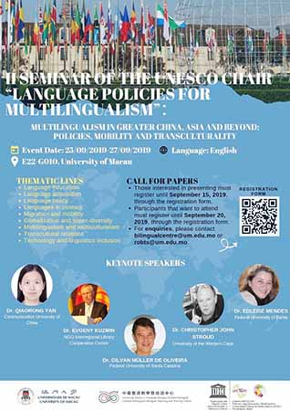 【特訊】由澳門大學人文學院葡文系“中葡雙語教學暨培訓中心"與聯合國教科文組織“多語語言政策”協會合辦的國際研討會將於9月25日(周三)揭幕。大會將以“大中華區、亞洲及其他地區的多語言:政策、流動性和跨文化性”為題,與來自世界不同地方的專家學者一同分享多語言教育的最新研究。歡迎參與。