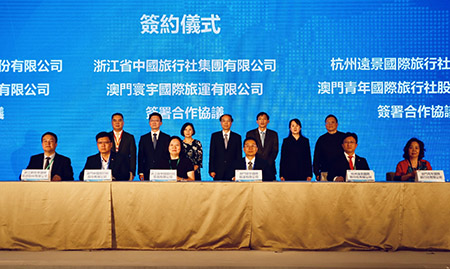 由杭州市政協港澳臺僑和外事委、杭州市文化廣電旅遊局主辦、澳門旅遊局、香港旅遊發展局支持的「杭港澳發展論壇暨杭港澳智慧旅遊高峰論壇」昨日舉行,杭州市政協主席潘家瑋、澳門中聯辦經濟部副部長徐俊、杭州市政協副主席王立華、澳門旅遊局副局長許耀明、香港旅遊發展局總幹事葉貞德、杭州市文化廣電旅遊局局長張鴻斌、阿里巴巴技術委員會主席王堅等出席主禮。會上,杭港澳三地旅行社協會、會議(會展)與獎勵旅遊業協會及杭港澳旅遊業者分別簽署了合作協定。