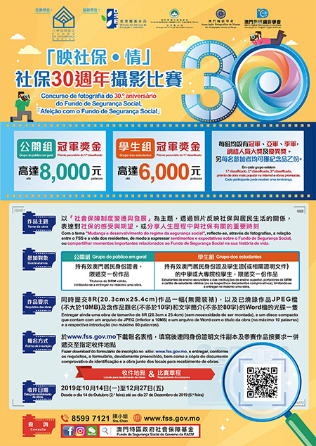 【特訊】社會保障基金將於明年邁向30週年,為讓居民共同見證其發展,社保基金舉辦“映社保‧情”社保30週年攝影比賽,冀透過活動啟發參加者思考雙層式社會保障制度對保障居民生活素質所起到的作用。比賽分學生組和公開組兩個組別,全澳居民均可參與,獎金最高達8,000澳門元,收件日期由即日起至12月27日。