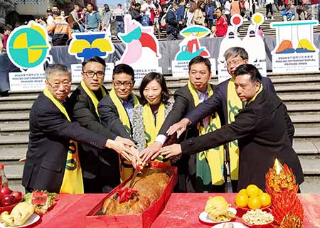 文化局於昨日中午在大三巴牌坊進行拜神儀式,以祈願慶祝澳門回歸祖國二十周年「二○一九澳門國際幻彩大巡遊」圓滿順利,文化局局長穆欣欣、旅遊局副局長程衛東、文化局副局長梁惠敏及陳繼春、治安警察局策劃行動廳廳長趙崇遠、消防局海島行動廳廳長鄺逸富、澳門街坊會聯合總會會長梁慶球、澳門航空股份有限公司總經理助理溫德鑫、澳門廣播電視股份有限公司電視製作科經理梁俊華及本地藝團代表等出席儀式。儀式設醒獅助慶,出席藝團代表悉心打扮,率先讓現場市民遊客感受大巡遊熱鬧氣氛,吸引眾多市民及遊客圍觀欣賞,氣氛歡愉。