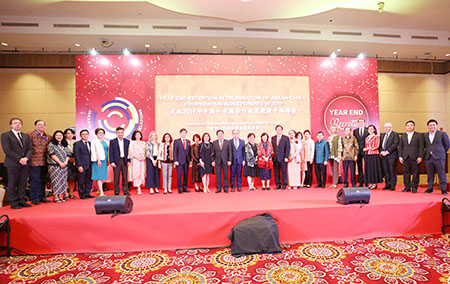 東盟副秘書長康富、德尼,中國-東盟關係協調國菲律賓常駐代表諾艾爾大使,東盟常駐代表委員會和對話夥伴國大使或代表,東盟秘書處高級官員,印尼當地智庫和媒體代表,華人華僑和中資企業代表等300多人出席招待會。康富、諾艾爾分別致辭。