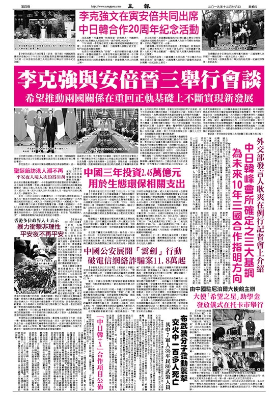 一是深化合作。三國一致同意增強政治互信,從戰略和長遠角度正視歷史、開辟未來,視對方發展為機遇,將在環保、氣變、衛生、老齡化、創新、體育、青少年等領域加強合作,不斷做大共同利益的蛋糕。三方還將加強“中日韓+X”合作,與更多國家實現共同發展。
