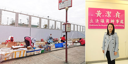 立法議員黄潔貞早前接獲居民反映,機場大馬路輕軌車廠一帶有無牌小販擺賣,就現場相片所見,商品的種類和數量繁多,包括三文治、飯盒、熟食及各式飲品等,不同於與過去市政署指無牌小販以背包或行季箱攜帶無牌食品的做法。在居民拍攝期間更有非本地居民光顧,相信無牌小販已經經營一段時間,情況值得關注。經向市政署反映,獲署方立即採取行動,到該地進行稽查執法,打擊非法行為,工作值得肯定。