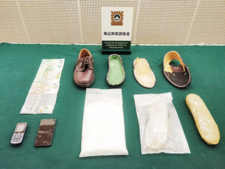 被捕南洲男子姓BLOU,26歲;司警表示,因應近期新冠肺炎毒疫情,司警與治安警駐機場出入加強對入境人士聯合調查,同時監控可疑的航班。前日傍晚涉案的南非男子乘飛機由新加坡抵澳,入境過關治安警發現疑人神色慌張,檢查其證件及簽證均没有問題,轉交駐機場的司警跟進。司警發現該男子穿著的皮鞋鞋底異常厚,同時重量與正常皮鞋不符,懷疑有人藏毒,結果於該對鞋底內起出逾1公斤的可卡因,毒品市值350萬澳門元。