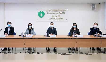 昨日新型冠狀病毒感染應變協調中心舉行例行記者會,仁伯爵綜合醫院醫務主任羅奕龍、教育暨青年局教育研究暨資源廳廳長黃健武、旅遊局執照及監察廳廳長陳露、治安警察局公共關係處處長李德輝及疾病預防控制中心傳染病防制暨疾病監測部協調員梁亦好共同會見傳媒。