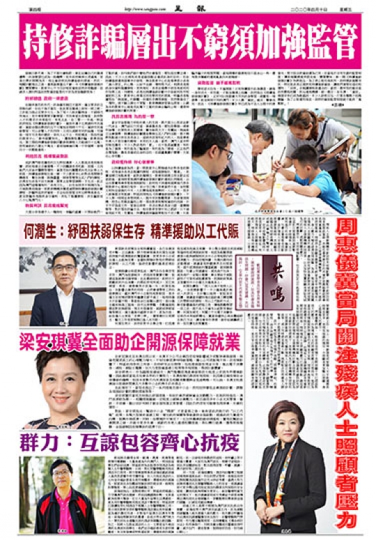 何潤生續指,「授人以魚不如授人以漁」,在疫情影響下,不少僱員處於無收入的狀況,生計難以維持,家庭深受困擾;建議當局儘快推出協助員工轉型轉工的帶薪培訓課程,用以工代賑的方式,解受影響僱員的燃眉之急,積極鼓勵學習一技之長,提升其人力資本以面對世事紛變。何潤生補充,有關三千元電子消費券目前仍未有細節釋出,冀當局儘快公佈具體細節及執行方法,讓社會早作準備,做好組織籌備工作,從而優化政策實施。