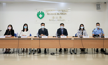 昨日新型冠狀病毒感染應變協調中心舉行例行記者會,仁伯爵綜合醫院醫務主任羅奕龍、教育暨青年局教育廳廳長黃嘉祺、旅遊局執照及監察廳廳長陳露、社會工作局研究及規劃廳廳長鄧潔芳、治安警察局行動及通訊處處長馬超雄、疾病預防控制中心傳染病防制暨疾病監測部協調員梁亦好共同會見傳媒。