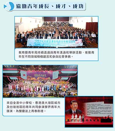 同時,特區政府也致力為年輕人創造更廣闊的發展空間,為澳門青年成長、成才、成功創造良好條件,特別是推動青年在不同領域積極建言和參與社會事務;組織不同的培訓交流項目,讓青年親身感受國家巨大的成就;安排青年前往內地體驗生活、了解國家經濟發展,從而培養愛國情操,此外,科普教育也是青年培養的重點之一。