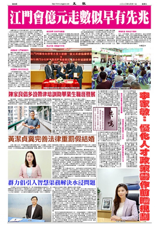 陳家良引述統計暨普查局的就業調查報告表示,隨着經濟形勢嚴峻,本澳就業市場亦大不如前,本年3至5月總體失業達2.4%,而本地居民失業率更升至3.4%。而市道蕭條下,相信不少企業難以有資源招聘新員工,即使仍有餘裕,亦傾向招聘經驗及職場技能更佳者,因此,預料未來畢業季過後,逾萬應屆畢業生及海外留學生要尋找心儀工作、投入職場更為困難,而失業率數字亦有可能再被推高。雖然現時勞工事務局亦有針對應屆的大專畢業生,推出如「疫境自強.職出前程」的職場體驗計劃,然而相關活動名額只有1800多個,在僧多粥少的情況下,對學生們的困境只是杯水車薪。陳家良建議政府起帶頭作用,推出更多帶津培訓計劃,主動及呼籲更多企業提供短期或實習崗位,一方面緩解企業人手的不足,另一方面亦能協助年輕人培養和獲得更多專業技能和職場經驗,讓他們為未來的職業生涯發展舖路;亦建議政府可與不同的社會團體合作,進行就業配對,幫助他們更快投入職場,緩解他們的家庭與自身經濟壓力之餘,亦能為社會注入新動力。