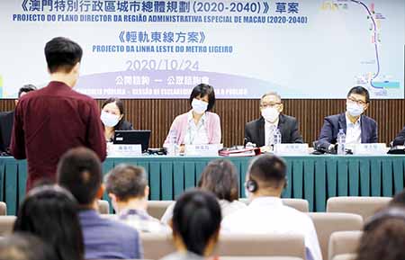 《澳門特別行政區城市總體規劃(2020-2040)》草案及《輕軌東線方案》自9月4日起至11月2日展開為期60日公開諮詢,期間合辦了7場諮詢會。政府呼籲公眾把握機會,在諮詢期內繼續踴躍發表意見。