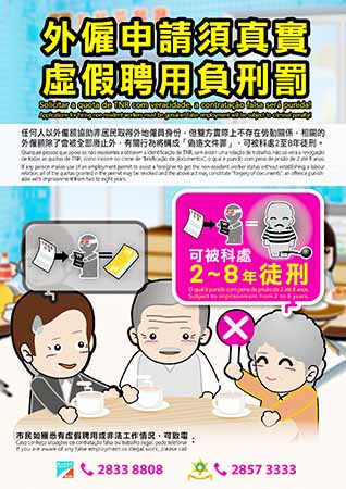 另一方面,勞工局與治安警察局保持緊密聯繫,透過訊息互聯互通的機制,跟進及監察獲批許可的僱主使用外地僱員的情況。同時,勞工局亦透過各種行政手段,包括不定期的抽查、出訪等方式,了解僱主聘用外地僱員的狀況。需要強調的是,不論任何部門通報或勞工局在處理個案時,懷疑存在虛假聲明、虛構勞動關係或不規則使用聘用許可狀況,會依法作出跟進,倘證實存在違規行為,除將廢止相關的聘用許可外,若當中涉及刑事犯罪,亦會轉介予相關的具權限部門跟進,在此呼籲市民應按實際需要提出家務工作外地僱員申請。