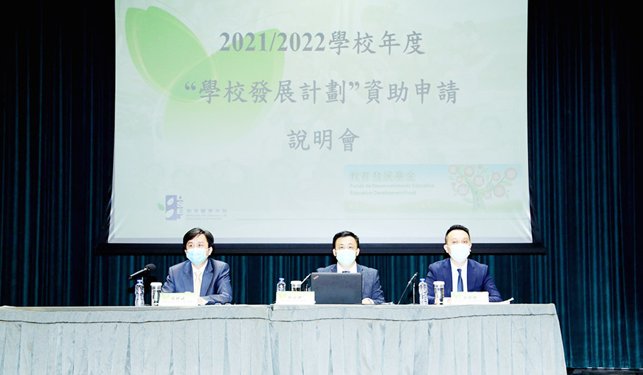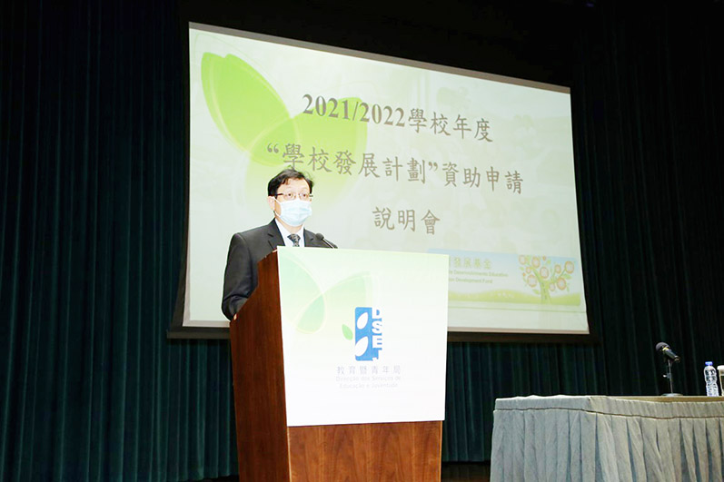 教育發展基金主席老柏生在致辭時表示,特區政府高度重視推動教育發展,培育人才。教育發展基金一直配合澳門教育長遠規劃,投入資源,推出多元資助計劃,支持學校開展各類教育計劃和活動,並表示學校需訂明清晰的工作守則,以提高學校人員的廉潔意識,強調學校有舉報涉嫌違法行為的義務。教青局教育研究暨資源廳廳長黃健武及教育廳廳長黃嘉祺分別介紹2021/2022學校年度「學校發展計劃」資助申請章程,並和與會者進行交流。