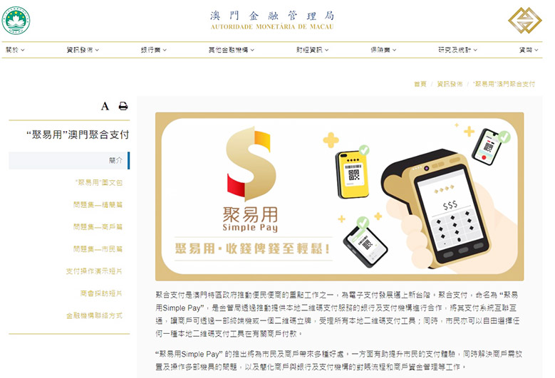 公眾可進入金管局官方網頁後,點選右方的超鏈結進入專頁(https://www.amcm.gov.mo/zh/news-and-announcements/simplepay)。專頁備有“聚易用”簡介、圖文包、針對商戶及市民的常見問題集、操作演示短片,以及相關銀行和支付機構聯絡等資訊,方便公眾瀏覽查閱。