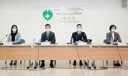 新型冠狀病毒感染應變協調中心昨日舉行例行記者會,仁伯爵綜合醫院醫務主任羅奕龍、治安警察局公共關係處處長李德輝、旅遊局公共關係處處長劉鳳池、疾病預防控制中心傳染病防制暨疾病監測部協調員梁亦好共同會見傳媒。