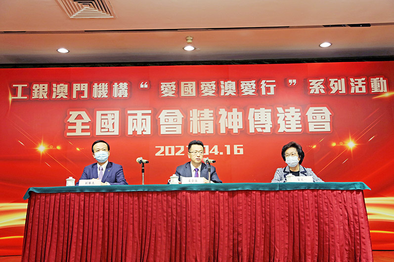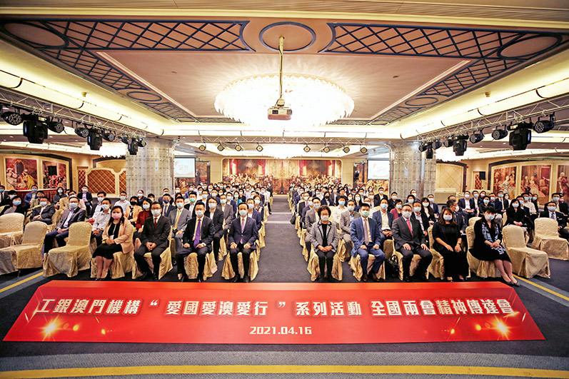 【特訊】中國工商銀行(澳門 )股份有限公司(下稱工銀澳門),日前舉行全國兩會精神傳達會,向工銀澳門員工分享全國兩會精神及發展概況,就國家工作報告、「十四五」規劃、 愛國教育工作等方面進行深入探討,全國人民代表大會澳門地區代表兼代表團團長劉藝良、中國人民政治協商會議全國委員會委員賀定一應邀出席作分享嘉賓,工銀澳門董事長姜壹盛、工銀澳門副行政總裁陳錦聯、鄧萬鴻、中國工商銀行澳門分行副總經理鄭凱以及全行上下近200名員工出席,冀藉此傳達國家經濟政策,促進澳門經濟多元化發展。
