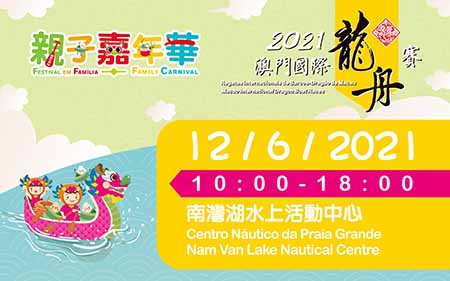 【特訊】由體育局及中國澳門龍舟總會主辦,市政署及行政公職局協辦的“2021澳門國際龍舟賽”活動將於本年6月12日至14日在南灣湖水上活動中心舉行。為增加活動氣氛,將於12日(星期六)早上10時至下午6時,在南灣湖水上活動中心舉行2021澳門國際龍舟賽–親子嘉年華,活動將以龍舟競渡為主題,無需預約入場,歡迎廣大市民及旅客參與。