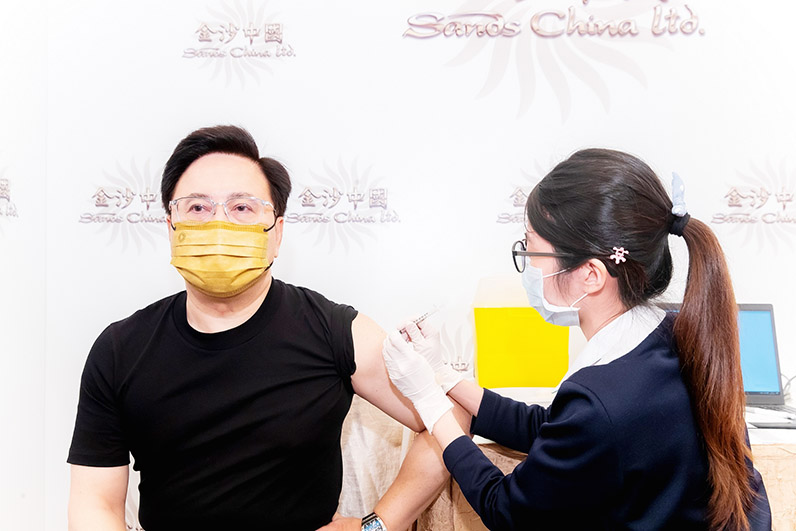 金沙中國有限公司總裁王英偉博士於7月5日身體力行與團隊成員共同接種疫苗,他表示:「為社區合力構建免疫屏障是每位成員的責任,樂見公司上下一心,踴躍登記接種疫苗,為維護澳門這座安全城市克盡己任。再次感謝澳門特區政府的領導,帶領社區共渡460多天無本地感染個案的卓越成果;同時就澳門衛生局協助團隊成員認識疫苗講解及外展接種專場致以衷心謝意。」