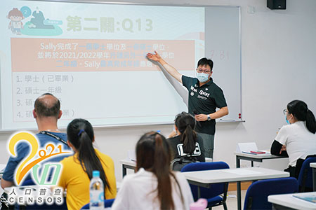 為確保培訓工作順利完成,統計局派出50位導師,合共72班為約2,600名學員進行普查員課堂培訓。内容包括理論與實踐兩個方面,導師會教授普查員各樣專業知識及技能,包括問卷內容、住戶訪問技巧、特別情況的應變方法,以及設備操作等。此外,人口普查熱線操作員及組長須接受額外的相關培訓。培訓學員的網上學習成績及課堂培訓期間的表現將作為整體評核的依據,合格的學員才被錄取參與8月的人口普查資料收集工作。