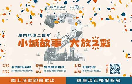 【特訊】澳門基金會表示,為慶祝“澳門記憶”文史網(www.MacauMemory.mo)開站兩周年,“澳門記憶”即日起至9月22日期間推出“小城故事 大放‘2’彩”系列活動,透過線上線下並行的活動巡禮,進一步加強與公眾的聯繫和互動,並吸引更多領域的人士關注、參與及傳承小城歷史文化。
