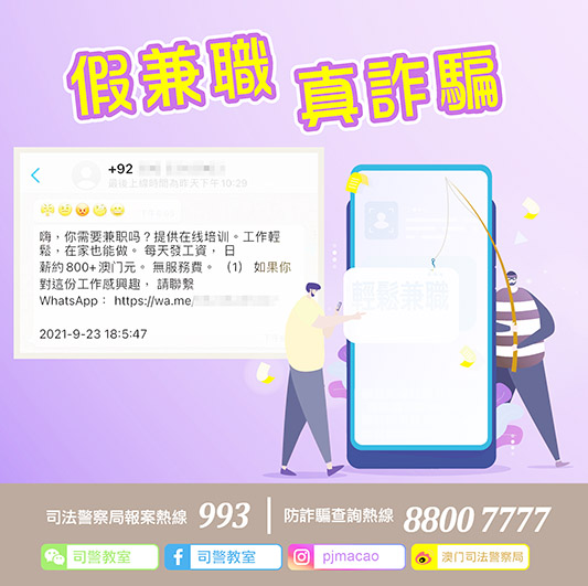 【特訊】近日司法警察局接獲司警局婦女防罪之友會員和市民反映,聲稱透過手機通訊軟件接到陌生人士傳來訊息,內容為招聘兼職員工,並附有網站連結。由於懷疑短訊存在詐騙成分,因此事主立即將該短訊刪除。