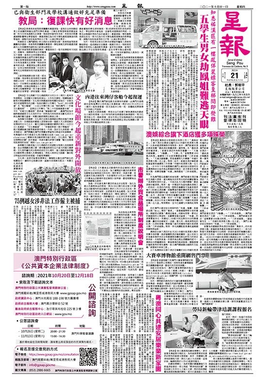 【特訊】文化局轄下文化場館將於10月21日(周四)起有序恢復開放,各項藝文活動包括演出、工作坊及課程、閲讀推廣活動等亦將陸續開展。文化局亦將嚴謹按照相關防疫指引,安排各項市民喜聞樂見的活動,包括計劃於11月舉行“hush! 2021音樂會”及“塔石藝墟”,11至12月舉行第三屆“相約澳門──中葡文化藝術節”, 並將在12月舉行“第二十四屆葡韻嘉年華”。今年“中葡文化藝術節”將串連“葡韻嘉年華”,讓澳門成為中國與葡語國家文化交流的平台,同時為市民和旅客呈獻充沛活力與生機的藝文盛會,有關活動詳情將在稍後公佈。