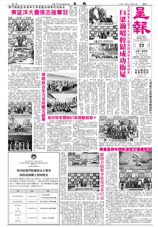 第68屆澳門格蘭披治大賽車的壓軸比賽「澳娛綜合澳門格蘭披治四級方程式大賽」今天舉行決賽,最後由澳門車手梁瀚昭連續兩年勇奪冠軍,亞軍及季軍分別為鄭穎聰及李思程。賽後由澳門特別行政區行政長官賀一誠頒發獎盃予冠軍車手,澳娛綜合常務董事梁安琪及秘書長官樂怡頒予亞、季軍車手。